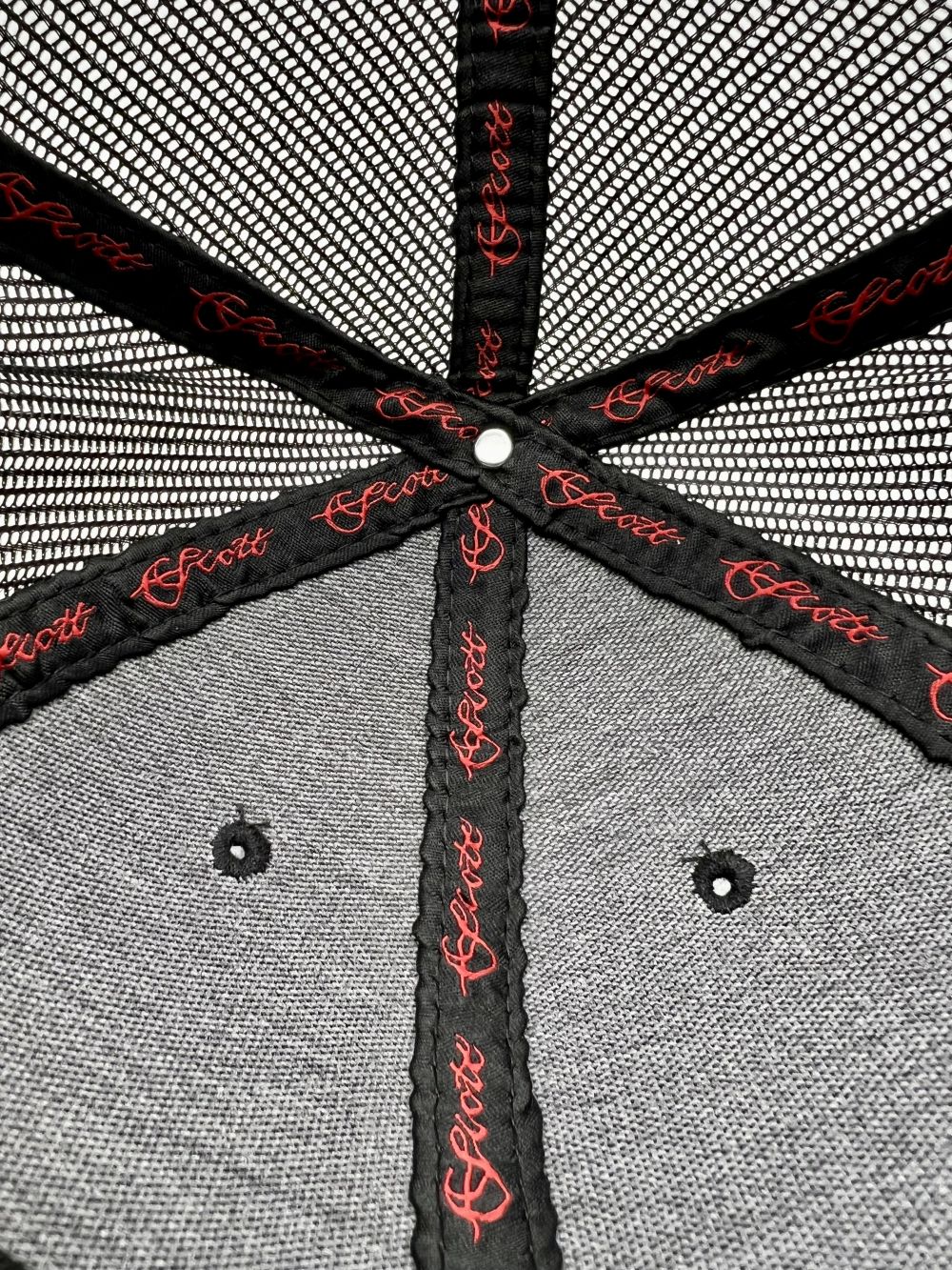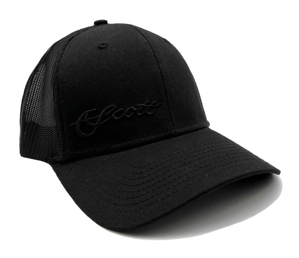 All black mesh snapback hat with red piping inside the hat