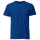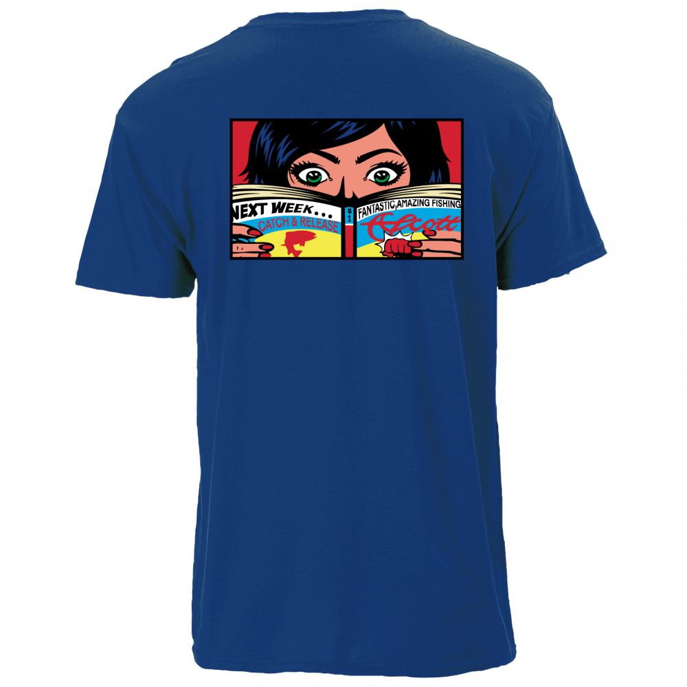 Metro blue T-shirt with a fly fisherperson looking at a magazine design on the back