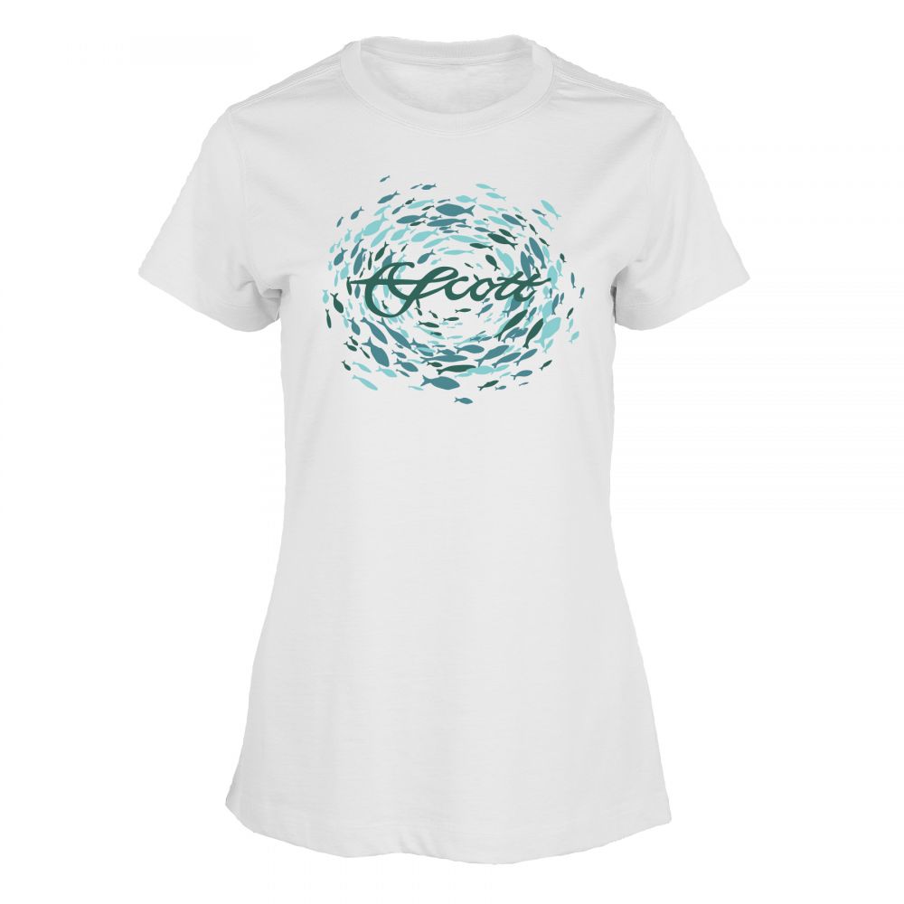 White short sleeve t-shirt with teal school of fish on front