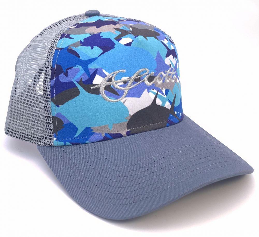 Multi fish camo hat is 100% cotton twill with contrast stitching nylon mesh. Custom Scott taping inside the cap with plastic snap closures for a perfect fit and dark under brim to reduce glare.