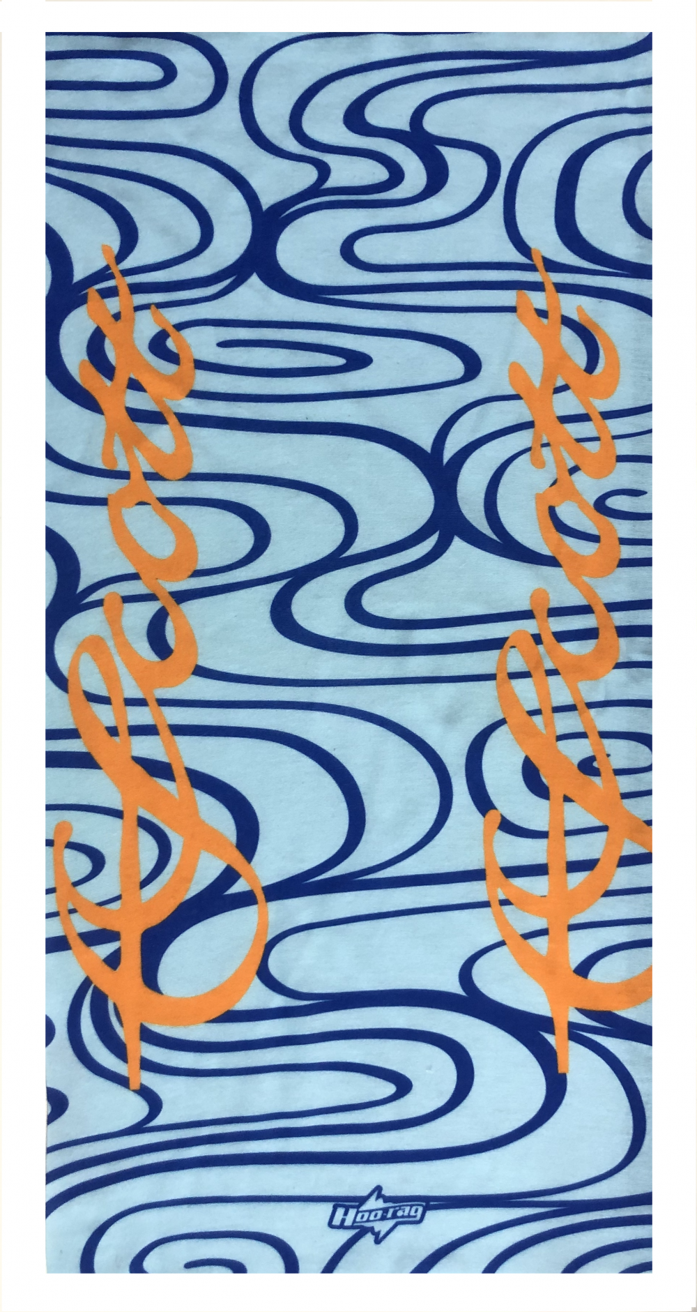 This face mask is light blue with water swirls with orange Scott scripts running on the side. You can wear Hoo-rags as face masks, neck gaiters, headwraps, scarves, beanies, hat liners, helmet liners and more.