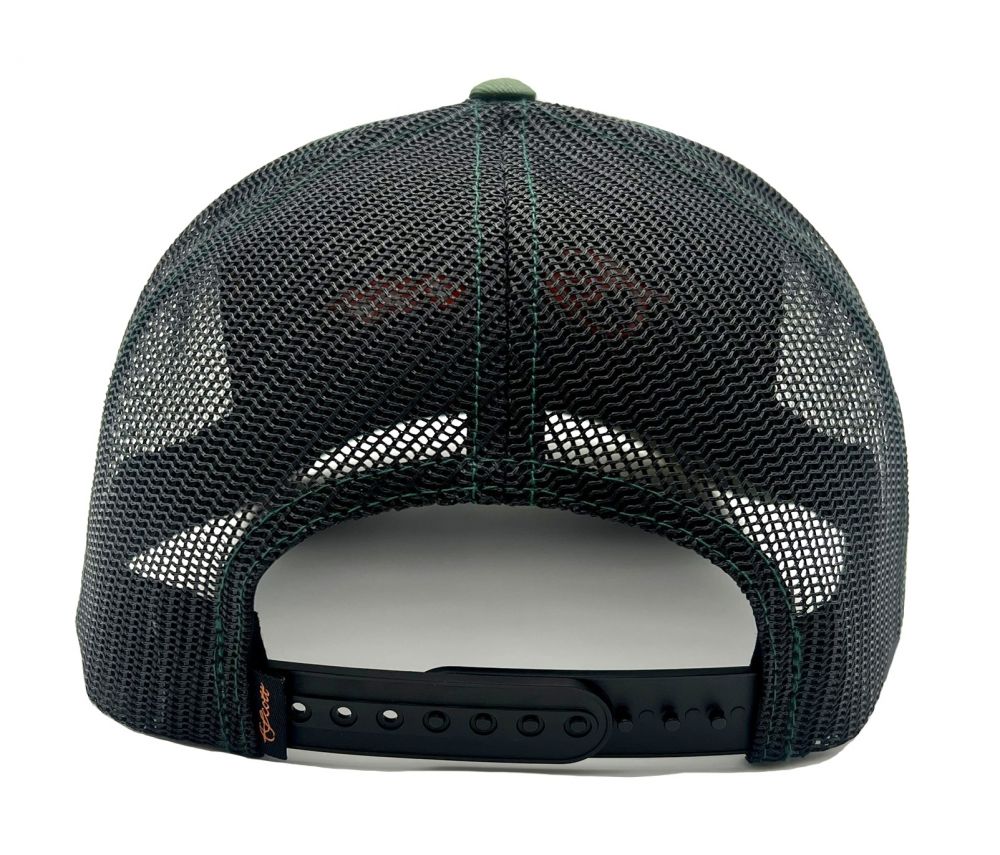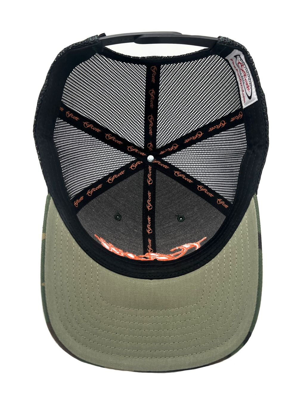Richardson Camo mesh snapback with an orange Scott script on the front