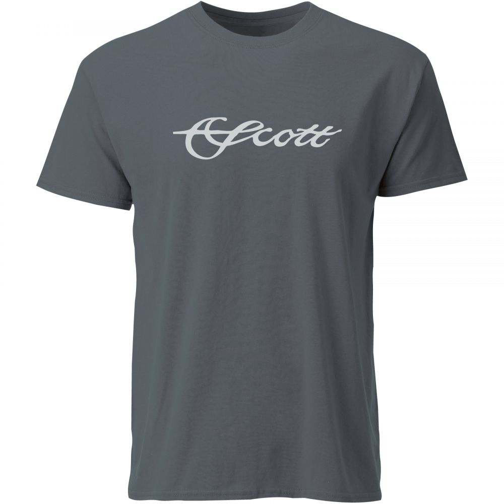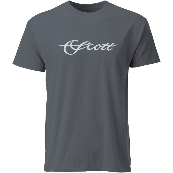 Charcoal short sleeve shirt with white Scott script on front